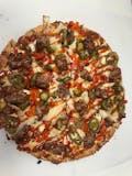 Primo signature blend cheese, pizza sauce, beef pepperoni, beef bacon, ground beef, and steak.