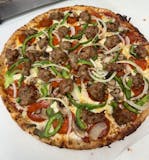Our signature blend of cheese, pizza sauce, pepperoni, sausage, green peppers, yellow onions, and mushrooms.